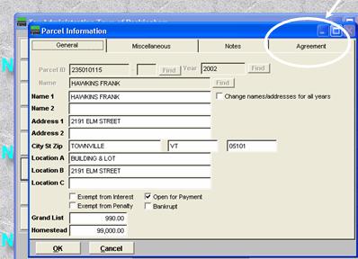 Agreements are just that. For instance Joan Smith owes 1,200 dollars of delinquent taxes on her property. The delinquent tax collector and her come up with terms that she will pay $100 dollars per month until the past due taxes are paid. You can track and print these documents by using the Agreement section of the program. Agreements may be created in 2 areas of the program. The first one is in 'Add History' the other is 'Change Parcel Information' both are located on the Main menu. In either place simply select the tab labeled 'Agreements'. Once you click on agreements simply type up the agreed terms.